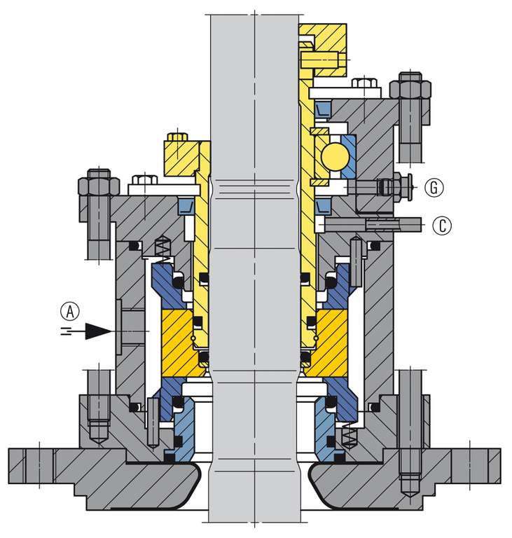Double seal (with integrated bearing) for glass-lined vessels to DIN 28136, connection flange to DIN 28137 and shaft ends to DIN 28159.